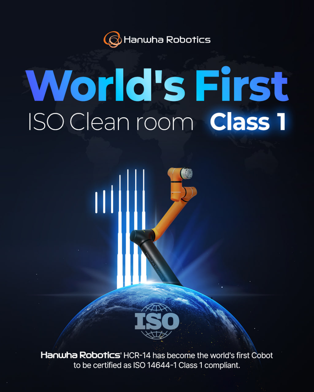 한화로보틱스는 협동로봇 HCR-14가 글로벌 인증기관 티유브이슈드(TÜV SÜD)로부터 클린룸 클래스1(Cleanroom class1) 인증을 받았다고 1일 밝혔다. 협동로봇이 청정도 최고 등급인 클래스1을 획득한 건 세계에서 한화가 처음이다.