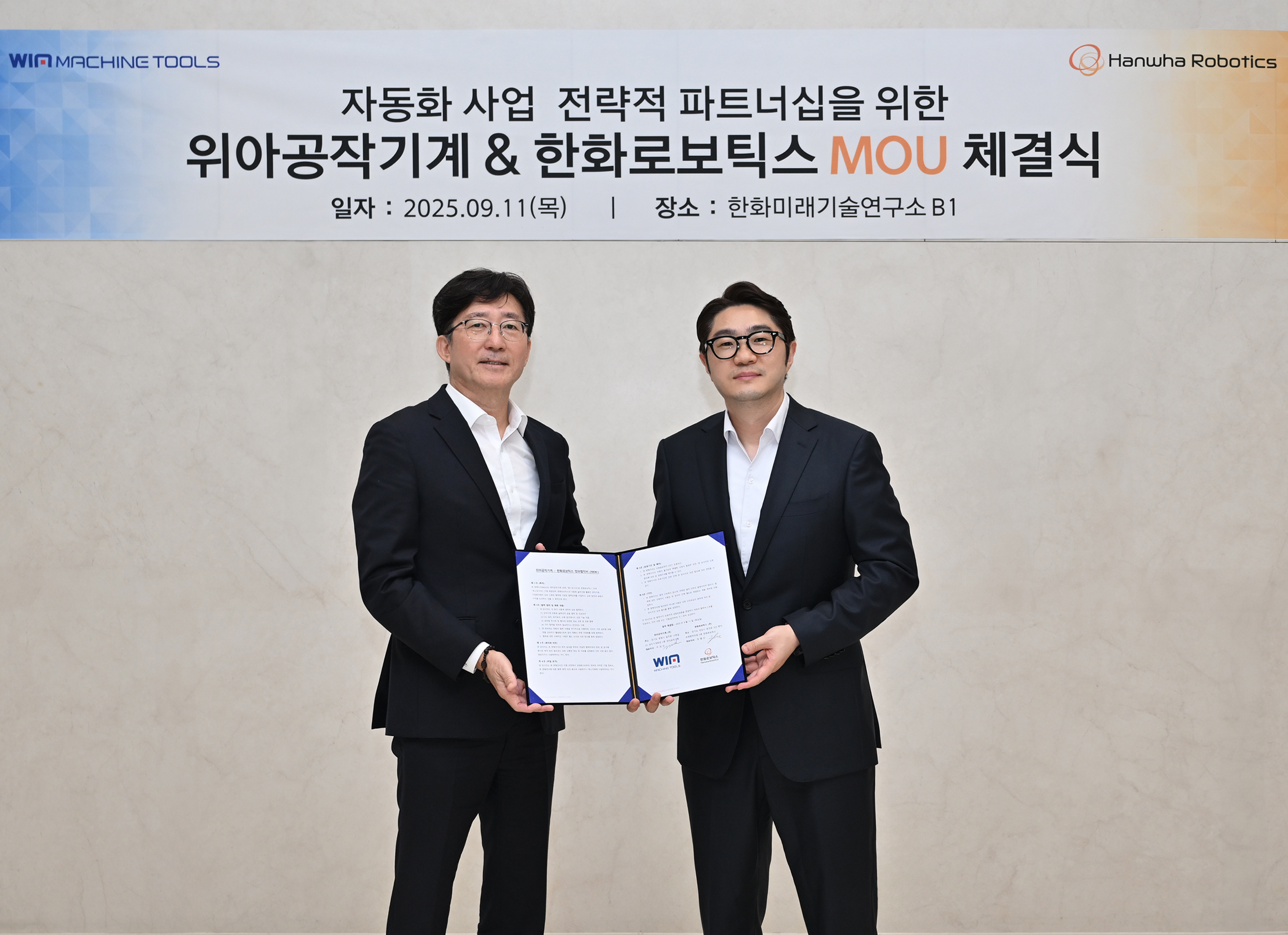 정병찬 한화로보틱스 대표이사와 주재진 위아공작기계 대표이사는 지난 11일 경기도 성남시 분당구 한화미래기술연구소에서 자동화 솔루션 분야 전략적 협력을 위한 양해각서(MOU)를 체결했다.